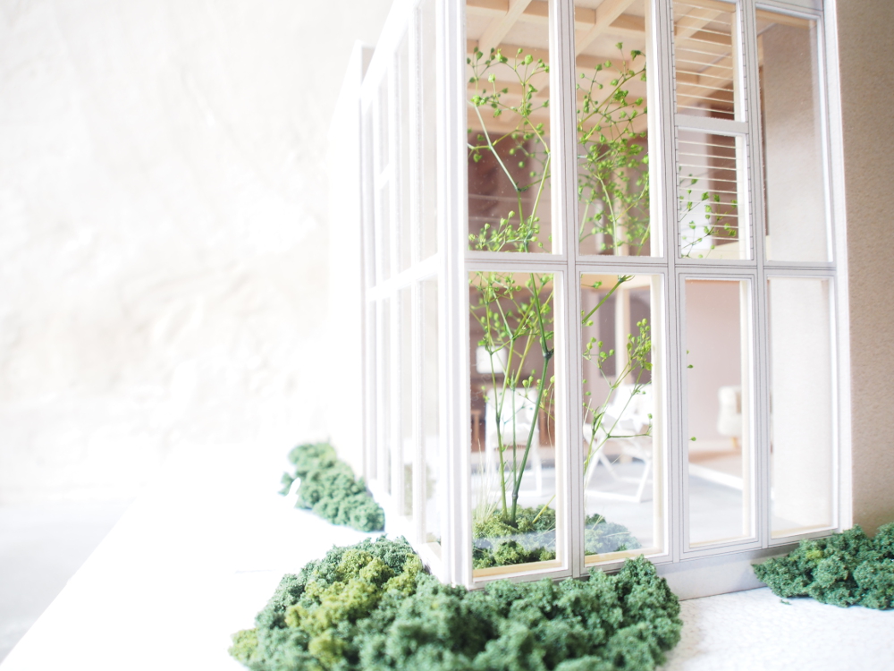 南東に配置した、ガラス張りのサンルームのような吹き抜けの土間空間(インナーテラス)を中心に、リビングやダイニングキッチン、個室を配置しました。インナーテラスと各個室はカーテンで仕切られており、ほとんど廊下はありません。こうすることで、普段の生活をしている中で知らず知らずの間に、太陽の光や木々の木漏れ日と触れ合うこととなるのです。また、各個室には大きな窓を設けていないので、たくさんの光が入ってくるインナーテラスへと、視線が向いていきます。